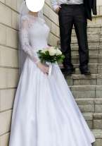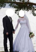 Продается свадебное платье белого цвета с длинными рукавами (А-силуэт). Вверх кружевное. Спина закрытая. Платье одевалось один раз. Куплено в 2015 году. Размер 42-44. Цена 13000 руб. Торг уместен.