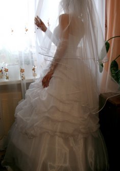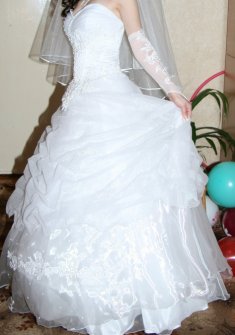 Свадебное платье б/у 1 раз, в отличном состоянии. размер 42-46 регулируется шнуровкой на спине. Корсет расшит стразами, двухслойная пышная юбка. В подарок отдаю обруч из пяти колец и перчатки.