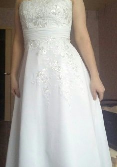 Продается белое свадебное платье А-силуэт, в идеальном состоянии после химчистки. Лиф платья украшен вышивкой и пайетками, они пришиты. Само платье очень качественное, выполнено из атласа ( ткань достаточно плотная, не мнется, хорошо держит форму), поверх атласа идет шифон. Платье для высоких девушек, при моем росте 176 см и 10 см каблук, длина была прям идеальна. Платье можно надеть с подъюбником для придания пышности. Звоните в любое время. Возможен торг
