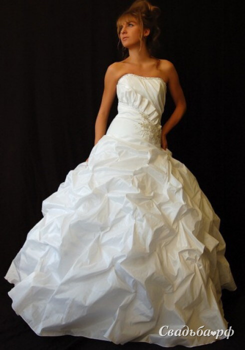 Классический корсет изящно драпирован итальянской тафтой. Вышивка бисером и бусами (Чехия), стразами SVAROVSKI. Юбка из итальянской тафты, собрана классическими подборками. Турнюр создает объем. Небольшой шлейфик. Диагональная драпировка на корсете подчеркивает линию талии.