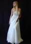 Платье модного покроя, в греческом стиле. Лиф красиво драпирован вертикальными сборками, вышит жемчугом (Польша). Юбка покрыта двумя слоями тонкой вуали, драпировки под грудью заложены в аккуратные складки. Бретели средней ширины расшиты жемчугом. Низ платья — атлас.
