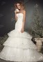 Свадебная магия, не иначе! В этом платье силуэта «русалка» любая девушка выглядит по-ангельски хрупкой и чертовски женственной. Секрет – в контрасте плотно обтягивающего корсета и невероятно пышной юбки, воланы которой по центру отделаны атласной, а по краю — фигурной кружевной лентой.