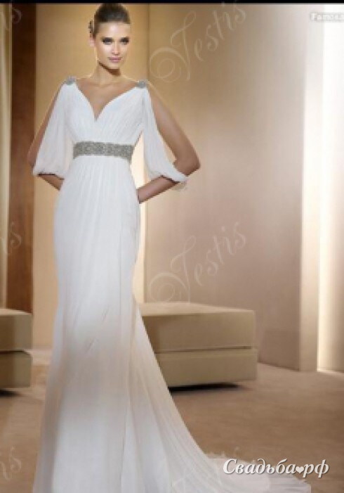 Легкое струящееся платье. Юбка плавно стекает по вашим ногам мягкими волнами и складочками. Лиф имеет легкую мелкую драпировку на груди. Рукава здесь выполняют чисто декоративную функцию. Они украшены блестящими бретелями из полосок ткани со стразами, которые также представлены в виде полоски под грудью.