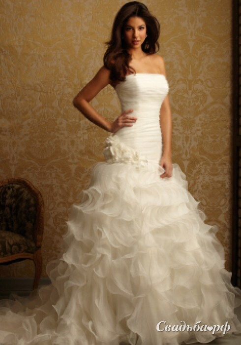 Платье с сильно заниженной линией талии. Корсет из шифона, полностью задрапирован. По низу корсета сбоку имеется аппликация в виде цветов. Юбка вся состоит из рюшей, фалд и воланов. Сзади тянется за вами небольшой шлейф. Очень нежное платье, для изысканной невесты. Размеры: 42, 44, 46.