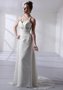 Платье простого кроя, которое одинаково подойдет как юной невесте, так и леди более зрелого возраста. Платье атласное. Линия талии лишь слегка задрапирована. Лиф под грудью украшен стразами, бисером и бусинами. Бретель через шею красиво подчеркивает грудь и открывает спину. Размеры: 42, 44.
