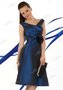 Элегантное вечернее платье из тафты, переливающейся разными оттенками синего – от темных и насыщенных до самых светлых тонов. Оригинальный лиф платья с треугольным вырезом-лодочкой и широкими бретелями, спущенными на плечи, заложен в эффектную драпировку, закрепленную на талии крупным цветком.