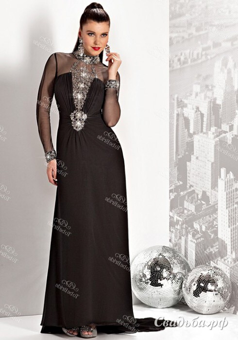 Размеры 6-16 (42-52). Иногда загадочная туманность воздушной ткани выглядит намного эффектнее и соблазнительнее самого открытого декольте. Это прямое полуприлегающее платье длиной в пол с полушлейфом из мистического черного шифона – великолепный вариант для создания запоминающегося образа. Манжеты длинных прозрачных рукавов, воротник-стойка и прозрачная вставка на лифе и спинке декорированы богатой вышивкой стразами, серебряными пайетками и бисером. При взгляде на Вас сердце замирает на миг... и начинает биться сильнее!